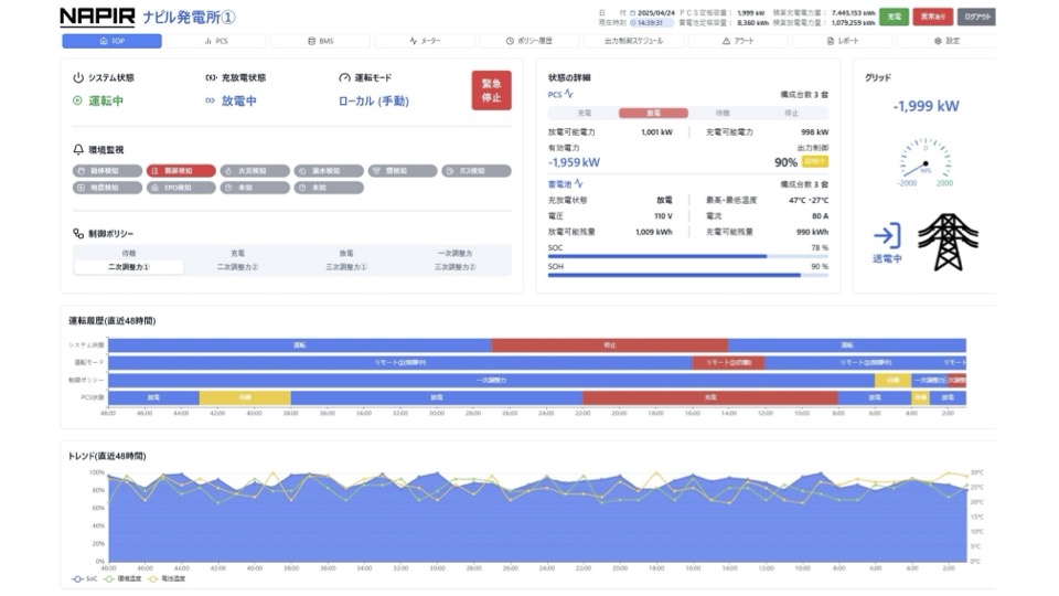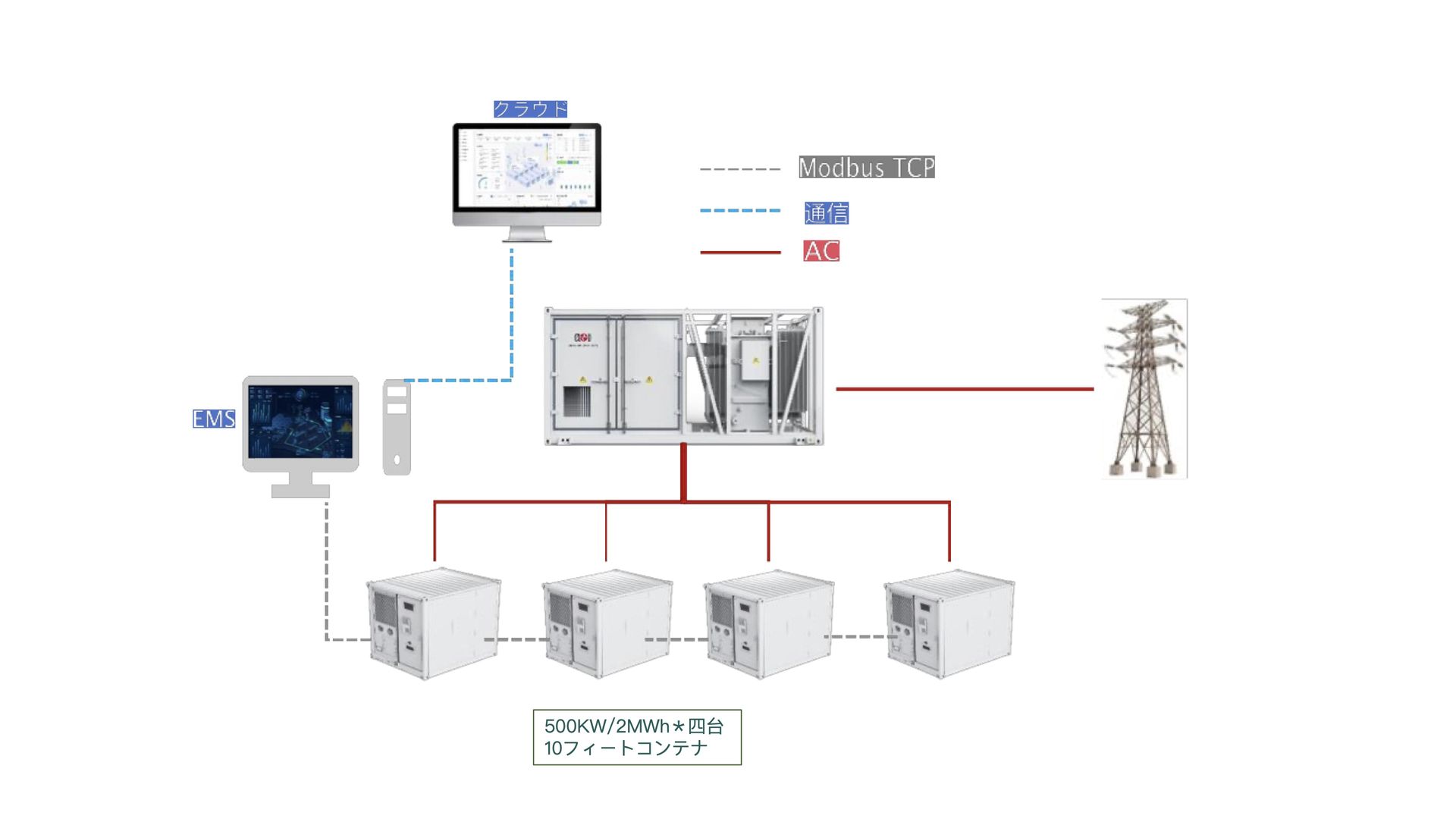 日本専用水冷式BESSは全ての設備は屋外式プレハブユニットであり、PCS、TMS、BMS内蔵され、関連会社Napir社製のEMSをプレインストールにより、顕著なコストの優位性をもたらす。